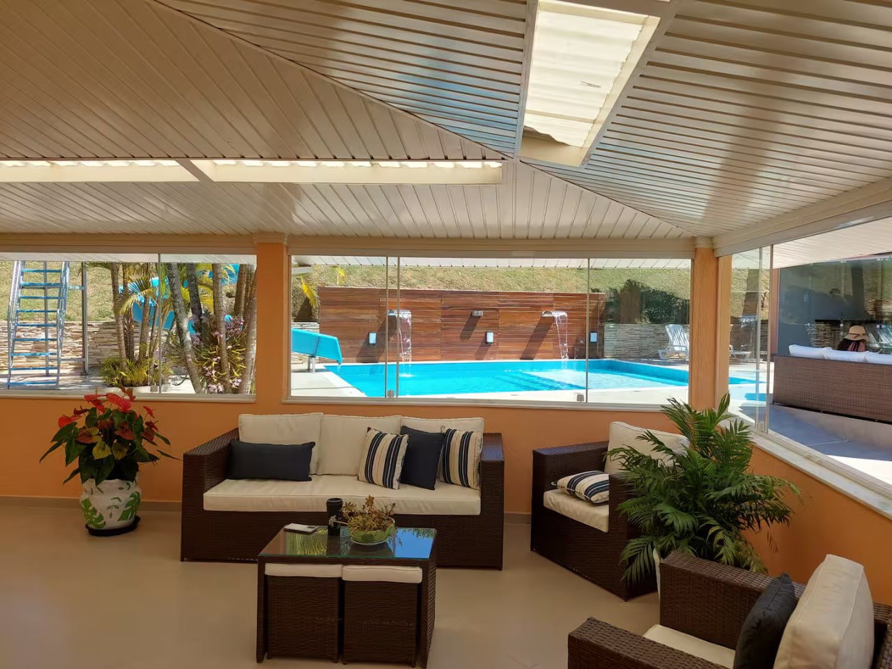 1 8×7 masonry pool with waterfall tube.